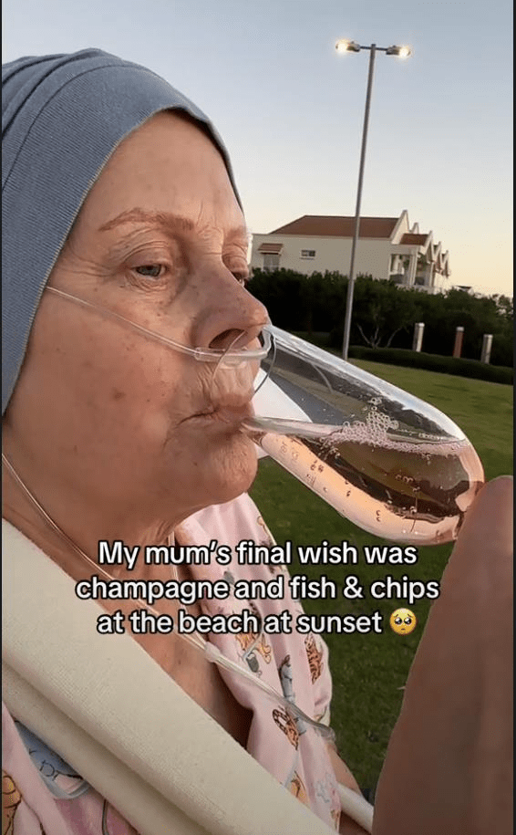 Njena ćerka, koja je bila duboko pogođena majčinom bolešću, odlučila je da ispuni ovu želju, uprkos svom unutrašnjem emotivnom slomu. Snimak koji je postavila na TikTok brzo je postao viralan, jer prikazuje poslednje dragocene trenutke koje je majka provela sa svojom ćerkom. Na snimku, vidimo majku koja, uprkos tome što je priključena na kiseoničku potporu, drži čašu šampanjca dok njen pogled luta prema horizontu, verovatno se opraštajući od sveta. Njeno lice, iako bledo i umorno, nosi tragove mira, zahvalnosti i ljubavi. Iako je smiraj života pred njom, majka oseća duboku povezanost s trenutkom i sa svojom porodicom.