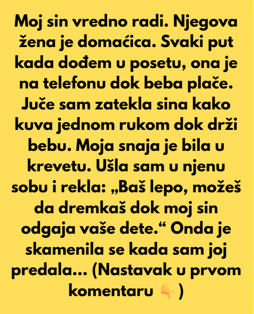 Često svraćam—možda više nego što se sviđa mojoj snaji, ali neko mora da se pobrine da stvari funkcionišu kako treba. Poslednjih nekoliko puta zatekla sam je kako leži u krevetu i skroluje telefon, dok beba plače, a kuća izgleda kao zona katastrofe. Flašice svuda, veš prepun, sudovi nagomilani.