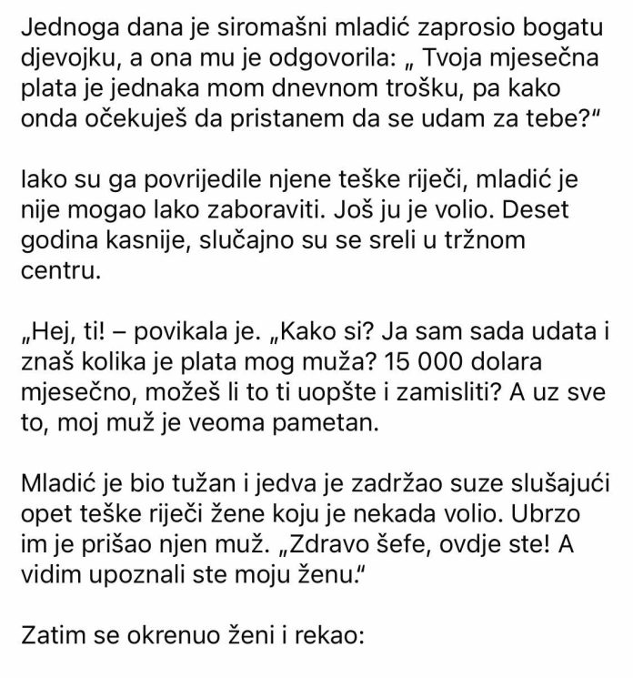 - U tom trenutku prišao im je njen muž. Ugledao je mladića i s osmijehom ga pozdravio riječima: „Zdravo, šefe, ovdje ste! Vidim da ste upoznali moju suprugu.“ Žena je iznenađeno pogledala, nesigurna šta se upravo događa. Tada je njen muž nastavio: „Draga, ovo je moj šef. On vodi poslove vrijedne 100 miliona dolara. Zamisli, postao je uspješan i bogat iz inata jednoj ženi. Čuo sam da ju je jako volio, ali ga je ona povrijedila. Da je ostala uz njega, danas bi imala život kakav je samo mogla sanjati.“