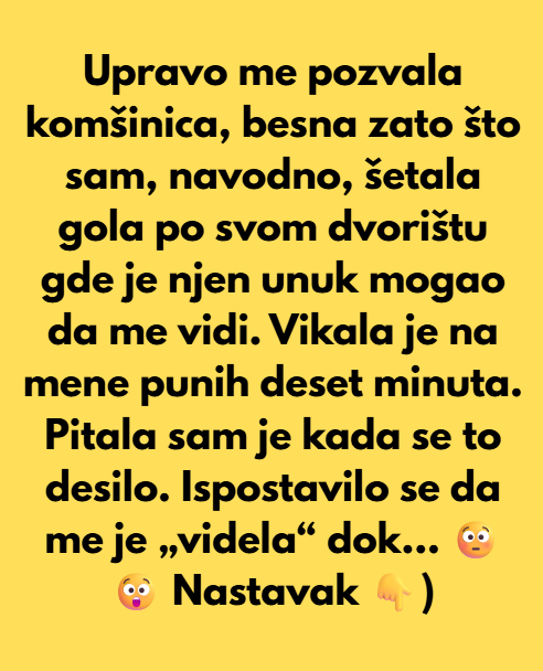 Pozvala me je besna, optužujući me da šetam gola po bašti, gde je, navodno, njen unuk mogao da me vidi sa njihovog balkona na spratu. Vikala je na mene deset minuta bez prestanka, ne dajući mi ni da dođem do reči.