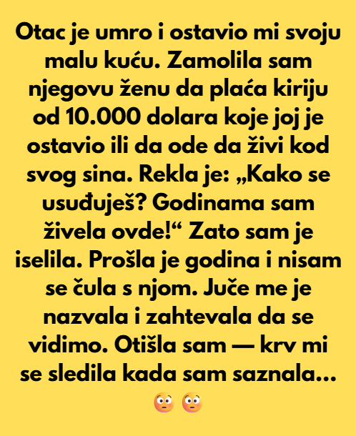 Otišao sam — krv mi se sledila kada sam saznao da je novi, mali stan u kojem živi kupio moj otac. Rekla je da je iskoristio ostatak svoje ušteđevine da joj ga kupi pre nego što je umro, kako bi imala sigurno mesto ako ikada bude izbačena. Potpisala je ugovor u kojem piše da će stan pripasti meni nakon njene smrti ako ostane u kući koju je delila s mojim ocem. Ali ako bude primorana da ode, može ga dati kome god želi — a sada ga ostavlja svom sinu.