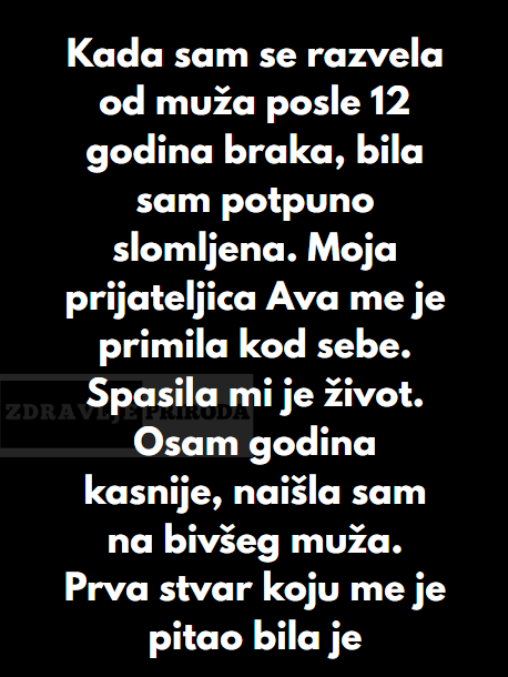 Kada sam se razvela od muža posle 12 godina braka, bila sam potpuno slomljena. Moja prijateljica Ava me je primila kod sebe. Spasila mi je život.