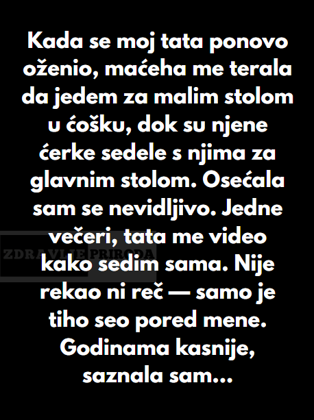 Kada se moj tata ponovo oženio, maćeha me je terala da jedem za malim stolom u ćošku, dok su njene ćerke sedele s njima za glavnim stolom. Osećala sam se nevidljivo, kao da ne pripadam. Jedne večeri, tata je došao kući ranije i video me kako sedim sama. Nije rekao ni reč — samo je tiho seo pored mene. Posle toga, stvari su počele da se menjaju. Počeli su da me zovu da sedim za velikim stolom.