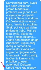 Kamiondžija sam. Svaki put kada vozim turu prema Mađarskoj, prolazim kraj jedne kuće u kojoj stanuje dječak koji ima Daunov sindrom.