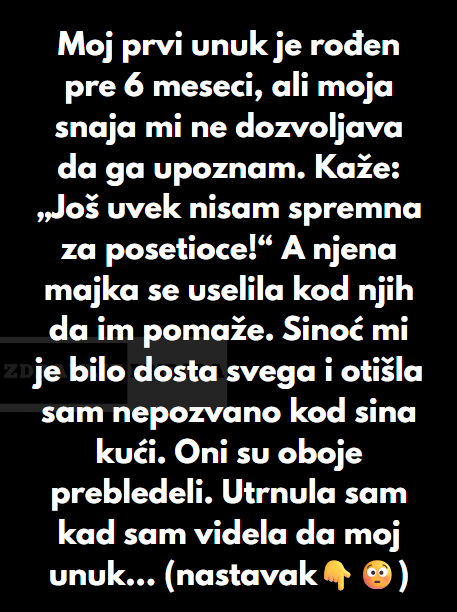 Moj prvi unuk je rođen pre šest meseci, ali moja snaja mi još uvek ne dozvoljava da ga upoznam. Stalno govori: „Još nisam spremna za posetioce.“ Nisam čak ni fotografiju videla — a njena majka se uselila da im pomaže.