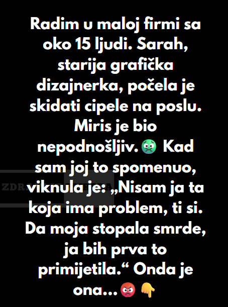 Sve je počelo suptilno. Sarah je počela skidati cipele na poslu. Miris je bio nepodnošljiv. Kad sam joj to spomenula, vrisnula je: „Nisam ja ta koja ima problem, ti si. Da moja stopala smrde, ja bih prva to primijetila.“ Zatim mi je prijetila da će me prijaviti HR-u. Pustila sam to, ali nakon sedmice, stvari su se drastično pogoršale.