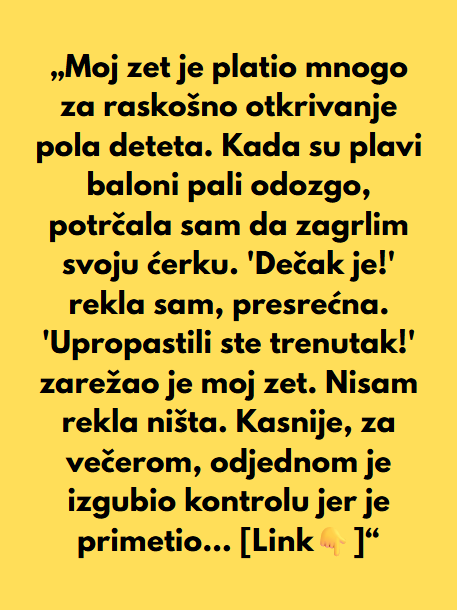 Moj zet je platio mnogo za raskošno otkrivanje pola deteta. Kada su plavi baloni pali odozgo, potrčala sam da zagrlim svoju ćerku.