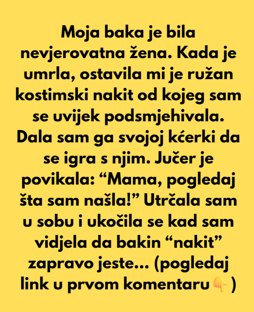 Jučer je povikala: “Mama, pogledaj šta sam pronašla!” Utrčala sam u sobu i ukočila se kad sam vidjela da bakin “nakit” zapravo nije bio ono što sam mislila. Jeftina boja se iskrzala i otpala s kamenčića, otkrivajući da su zapravo vrlo vrijedni dragi kamenčići, pravi mali bogatstvo.