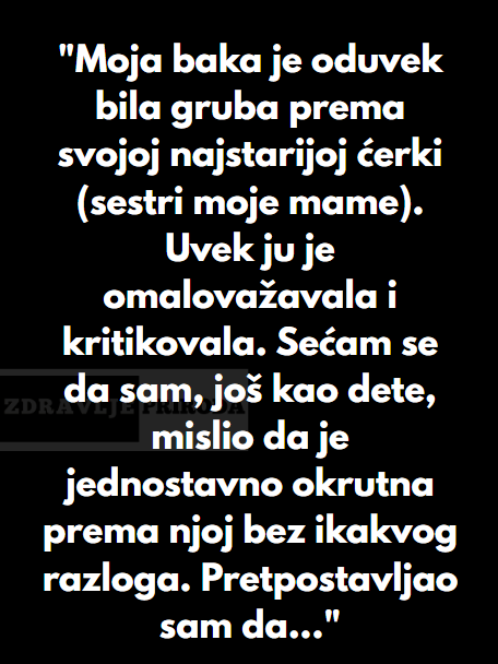 The post “Moja baka je oduvek bila gruba prema svojoj najstarijoj ćerki (sestri moje mame)…” appeared first on Zdravlje priroda.