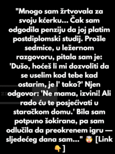 Nakon tog razgovora, nisam mogla da prestanem razmišljati o svemu. Mnogo sam žrtvovala za nju. Nikad se nisam ponovo udala. Čak sam odgodila penzionisanje da joj platim postdiplomski studij, a planirala sam joj pomoći i s kaparom za stan sljedeće godine…