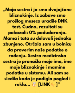**„Moja sestra i ja smo dvojajčane bliznakinje. Iz čiste zabave uradile smo DNK test prošlog meseca. Čudno, rezultati su pokazali: 0% podudaranja. Mama i tata delovali su jednako zbunjeno. Rešena da dobijem odgovore, otrčala sam u bolnicu da proverim naše podatke o rođenju. Medicinska sestra je pronašla moje ime, ime moje sestre i mamine podatke u sistemu. Ali sam se sledila kada je zastala, pogledala me i rekla: ‘Obe ste rođene ovde, istog dana… ali u različitim porođajnim salama.’