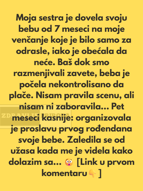 U to vreme, njena beba je imala 7 meseci. Pokušala sam da budem obzirna i nežno joj rekla: „Potpuno ću razumeti ako ne možeš da dođeš. Biće mi žao, ali stvarno želimo da događaj bude bez dece.“ Obećala je da razume. Ali na veliki dan, ona je ipak dovela bebu. Ušunjala se u sedište pozadi i šapnula: „Ne brini, biće tih.“ Ali dok smo razmenjivali zavete, beba je počela nekontrolisano da plače.