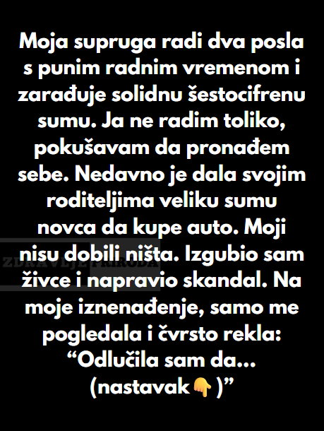 Rekla mi je da ljubav nije izgovor da neko živi na račun drugog zauvijek, i da “odbija da finansira moje osjećaje krivice prema mojim roditeljima”. To me stvarno povrijedilo. Trudim se. Nisam lijen. Samo još nisam naišao na pravu priliku. I kad naiđem — vjeruj mi, sve ću ovo zapamtiti. Neću zaboraviti ovu dvostruku mjeru.