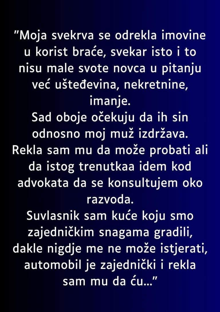 Rekla sam mu da ako da bilo kakav novac svojim roditeljima, odmah ću dati otkaz na svom poslu, jer nemamo nijednu korist od njih, a cijelo vrijeme mi samo oduzimaju. Ne želim biti u situaciji da mi, moj muž i naša djeca, budemo zakidani zbog nesposobnosti njegovih roditelja. Njihov prioritet je očigledno imanje, dok su zanemarili svoje vlastite obaveze prema nama. I to neće moći proći. Ako muž odluči da im daje novac, morat će onda on snositi odgovornost za alimentaciju za našu djecu, i neka od preostalog novca izdržava svoje roditelje ako to uopšte može.
