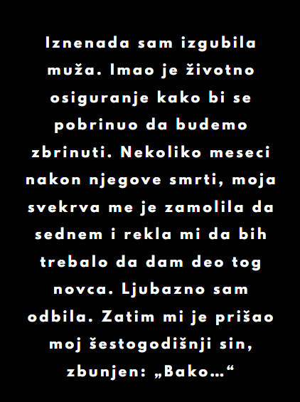 Njihovo obrazloženje? „Naš sin i tvoj muž bi to želeo.“ Želela sam da budem saosećajna. Zaista jesam. Ali taj novac više nije bio njegov da ga deli — ostavio ga je za našu decu. Za njihovo obrazovanje, njihovu dobrobit, njihovu budućnost. Mojim tastu i tašti to nije bilo važno. Kada sam ih ljubazno odbila i rekla da prvo moram da obezbedim budućnost deci, počeli su da me emocionalno ucenjuju.