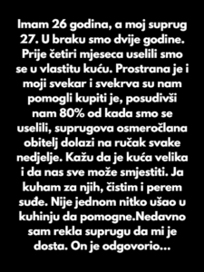 No od kada smo se uselili, suprugova osmeročlana obitelj dolazi na ručak svake nedjelje. Kažu da je kuća velika i da nas sve može smjestiti. Ja kuham za njih, čistim i perem suđe. Nije jednom nitko ušao u kuhinju da pomogne.