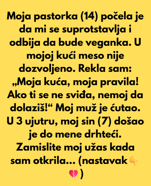 U mojoj kući meso nije dozvoljeno. Moja pastorka (14) počela je da mi se suprotstavlja i odbija da bude veganka. Rekla sam: „Moja kuća, moja pravila! Ako ti se ne sviđa, nemoj da dolaziš!“ Moj muž je ćutao. U 3 ujutru, moj sin (7) došao je do mene drhteći.