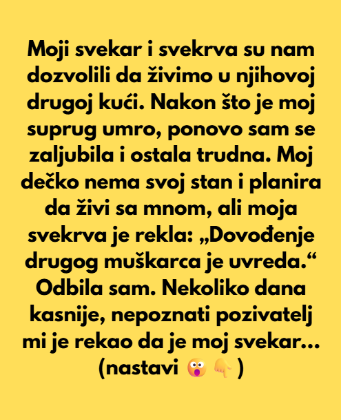 Moji svekar i svekrva su nam dozvolili da živimo u njihovoj drugoj kući kada smo se venčali. Ubrzo nakon toga, moj muž se razboleo i preminuo pre nego što smo mogli da zasnujemo porodicu. Moji svekar i svekrva su me podržavali i rekli da mogu da nastavim da živim tamo.