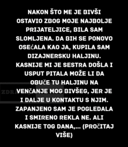 „Oh! Nova haljina“ upitala je, prelazeći prstima preko materijala kao da je njena. „Da,“ odgovorila sam, već osećajući da nešto nije u redu. Onda, kao da je to ništa posebno, pogledala me je i rekla: „Dakle… mogu li da je obučem na venčanje? Moram da izgledam sjajno.“