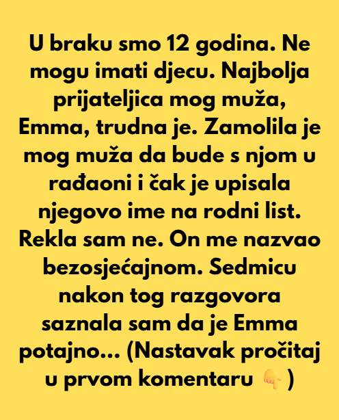 Rekla sam apsolutno ne. To je ogromna, životna odluka koja utječe na naš brak i našu obitelj. Nick me nazvao “čudovištem” i “okrutnom” jer ne mogu imati djecu, pa je, po njemu, ovo njegova jedina prilika da bude otac. Već je obećao Emmi da će biti uz nju na porodu i čak je naveden kao njezin kontakt za hitne slučajeve.