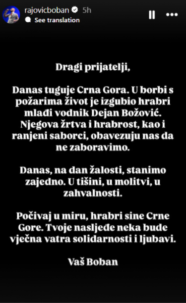 U svojoj poruci opisao je Dejana Božovića kao “hrabrog sina Crne Gore”, čije nasleđe treba da ostane trajna inspiracija – vatra solidarnosti i ljubavi koja će vječno gorjeti u srcima ljudi. Bobanove riječi nisu bile samo izrazi tuge, već i podsjetnik da se u kriznim situacijama pokazuje pravo lice zajedništva, ono koje nadilazi sve podjele i razlike.