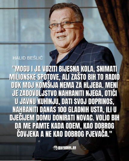 Naime, Halid je objavio poruku u kojoj je podijelio svoja razmišljanja o luksuzu, bogatstvu i stvarnim vrijednostima života. U objavi je napisao: „Mogu i ja voziti bijesna kola, snimati milijunske spotove, ali zašto bih to radio dok moj susjed nema za kruh. Meni je zadovoljstvo nahraniti njega, otići u javnu kuhinju, dati svoj doprinos, nahraniti danas 100 gladnih usta, ili u dječjem domu donirati novac. Volio bih da me pamte kada odem, kao dobrog čovjeka, a ne kao dobrog pjevača“. Ove riječi odišu dubokom humanošću, pažnjom prema drugima i sviješću da pravi uspjeh nije u materijalnom bogatstvu, već u tome koliko možemo pomoći onima kojima je najpotrebnije.