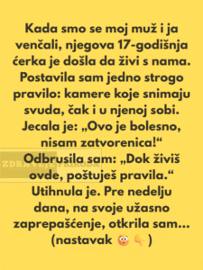 Postavila sam jedno strogo pravilo: kamere koje snimaju svuda, čak i u njenoj sobi. Jecala je i molila: „Molim te, samo želim privatnost! Ovo je bolesno, nisam zatvorenica!“ Odbrusila sam joj: „Privatnost ne postoji pod mojim krovom. Dok živiš ovde, poštuješ pravila.“ Ućutala je. Pre nedelju dana, na svoje strašno zaprepašćenje, otkrila sam da je Hana noću isključivala kameru u svojoj sobi, a ujutru je ponovo uključivala.