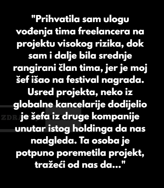 Prihvatila sam ulogu vođenja tima freelancera na projektu visokog rizika, dok sam i dalje bila srednje rangirani član tima, jer je moj šef išao na festival nagrada. Usred projekta, neko iz globalne kancelarije dodijelio je šefa iz druge kompanije unutar istog holdinga da nas nadgleda.