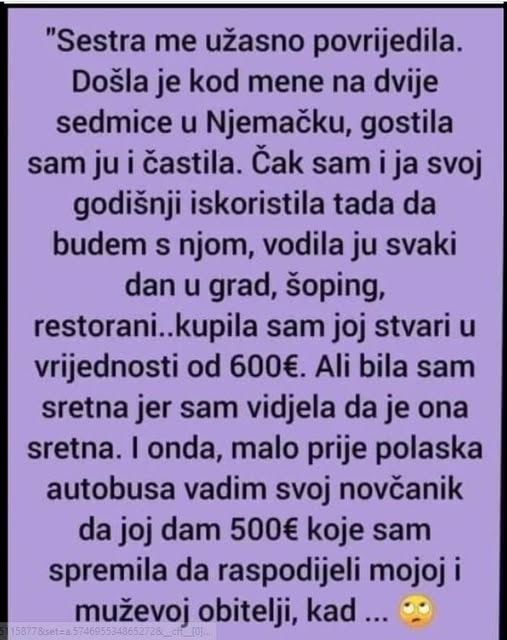 The post “Sestra me užasno povredila.Došla je kod mene na dve sedmice u Nemačku,gostila sam ju i….” appeared first on Zdravlje priroda.