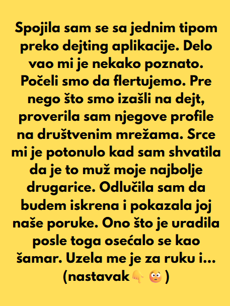Spojila sam se sa jednim tipom preko dejting aplikacije. Delovao mi je nekako poznato, ali sam to zanemarila. Počeli smo da flertujemo. Pre nego što smo izašli na dejt, proverila sam njegove profile na društvenim mrežama. Srce mi je potonulo kad sam shvatila da je to muž moje najbolje drugarice.