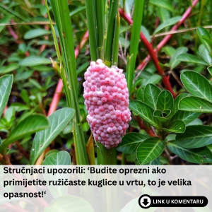 Naizgled nježne i zanimljive, ove kuglice zapravo mogu skrivati opasnost koja dolazi iz dalekih krajeva svijeta. Kada su vanjski uvjeti hladni i vlažni, stvara se idealno okruženje za razvoj određenih štetnika, a jedan od najopasnijih je jabučni puž – invazivna vrsta koja je, kako navodi “Dnevnik.hr”, porijeklom iz Južne Amerike, ali se proširila i na europske prostore. Ti slatkovodni puževi, koji spadaju među najveće na svijetu, polažu jaja u prepoznatljive ružičaste grozdaste nakupine, obično na stabljike biljaka koje rastu u vodi ili uz vodene površine.