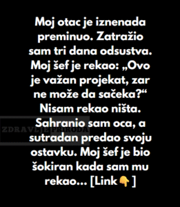 Moj otac je iznenada preminuo. Tuga me je pogodila snažno. Poslao sam poruku šefu, ljubazno tražeći tri dana odsustva. Nazvao me nestrpljivo: „Ovo je važan projekat. Zar ne može da sačeka“ Tada sam shvatio sve što sam trebao znati. Nisam rekao ništa, uzeo sam slobodne dane i otputovao kući da sahranim oca.