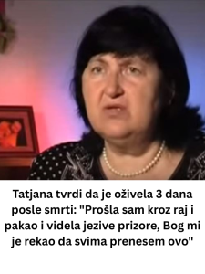 - Tatjana je, usled tumora na mozgu, završila na operacionom stolu. Tokom operacije preminula je, a njeno telo je odneto u mrtvačnicu. Kada je porodica došla po telo tri dana kasnije, dočekala ih je zapanjujuća vest – Tatjana je oživela. Jedino je njen suprug, Večeslav, bio uveren da će se njegova žena vratiti u život jer je, kako kaže, imao duhovnu poruku od Boga.