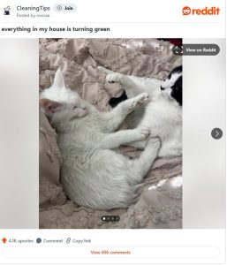 Dok je već bila na ivici da odustane od istraživanja, žena je naišla na jedan komentar na Redditu koji je sve promenio. U tom trenutku, jedan korisnik je postavio pitanje o mogućem uzroku – da li su novi traperice brenda Old Navy uzrokovale zelene mrlje na predmetima u domu. Žena je ignorisala ovaj komentar jer ni ona ni njen muž nisu nosili traperice tog brenda, ali je drugi komentar izazvao njenu sumnju: „Zamislite da otkrijete da vam muž vara putem činjenice da vam mačka postane zelena“