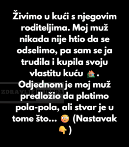 Živimo u kući s njegovim roditeljima. Moj muž nikada nije želio da se odselimo ili kupimo vlastitu kuću, pa sam se ja trudila i radila da to postignem sama. Vremenom sam uspjela da uštedim oko 35% za kaparu na kuću. Željela sam da kupim svoju vlastitu kuću na koju bih bila ponosna, i konačno sam našla onu iz snova.