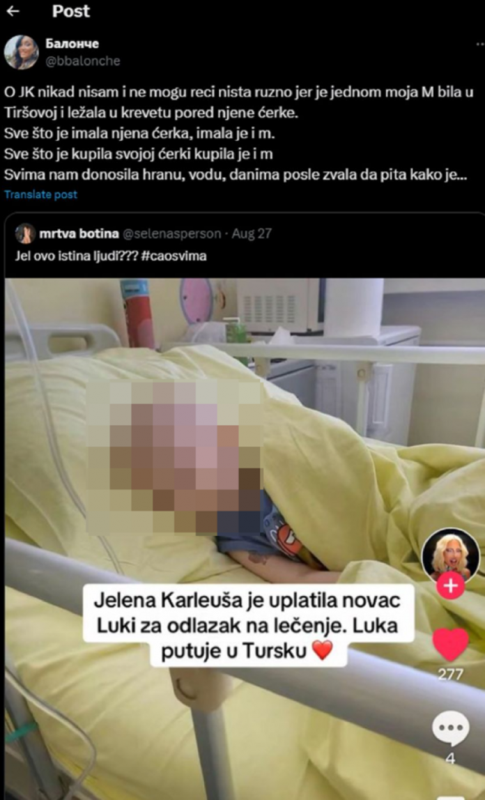 Pored donacije, još jedan snažan trenutak je stigao sa društvene mreže X (nekadašnji Twitter), gde je jedna žena podelila svoje iskustvo sa Jelenom. Ova žena je ispričala kako je Jelena pokazala izuzetnu pažnju prema svojoj kćerki, ali i njenoj mami, koja je bila hospitalizovana u Tiršovoj bolnici u Beogradu.