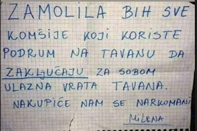 Magazin Žena je ostavila 0bavijest u kojoj moli susjede da zaključavaju tavan, razlog je urnebesan Piše ❤ - 25.11.2025 FacebookTwitterPinterestWhatsApp Pristojna zamolba susjede Milene potpuno je razumljiva, ali toliko je neposredno bubnula razlog zbog kojeg inzistira na zaključavanju “podruma na tavanu” da je oduševila cijelu regiju. …