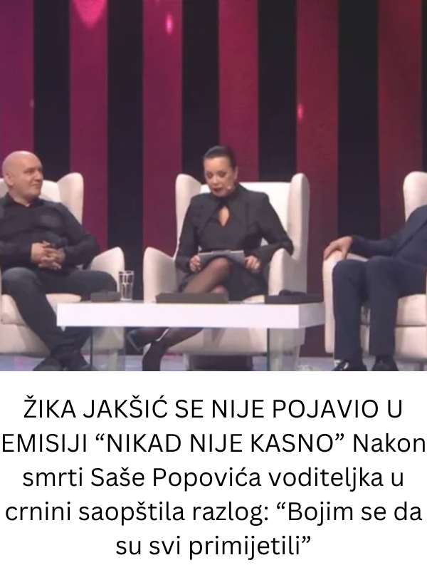 Naslovna ŽIKA JAKŠIĆ SE NIJE POJAVIO U EMISIJI “NIKAD NIJE KASNO” Nakon smrti Saše Popovića voditeljka u crnini saopštila razlog: “Bojim se da su svi primijetili” ŽIKA JAKŠIĆ SE NIJE POJAVIO U EMISIJI “NIKAD NIJE KASNO” Nakon smrti Saše Popovića voditeljka u crnini saopštila razlog: “Bojim se da su svi primijetili”